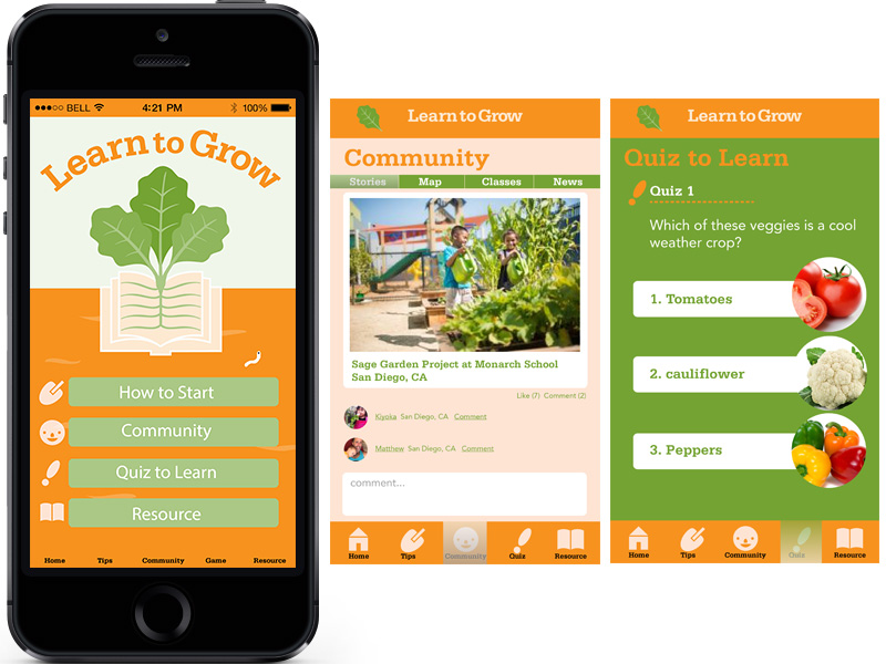 The main goal of the Learn to Grow campaign is to help children, families and schools learn and grow together through gardening. The design of the icon show the strong connection between learning and growing vegetables to appeal the audience the importance of gardening. The sticker, the buttons and the promotional item will help people gain interest in the cause. The iPhone app contains the guidance for gardening beginners, a virtual gardening community to connect people, and a gardening quiz for educational purpose.